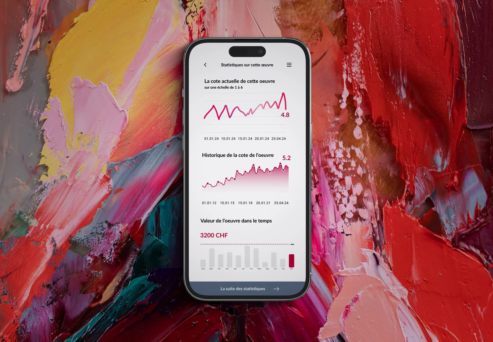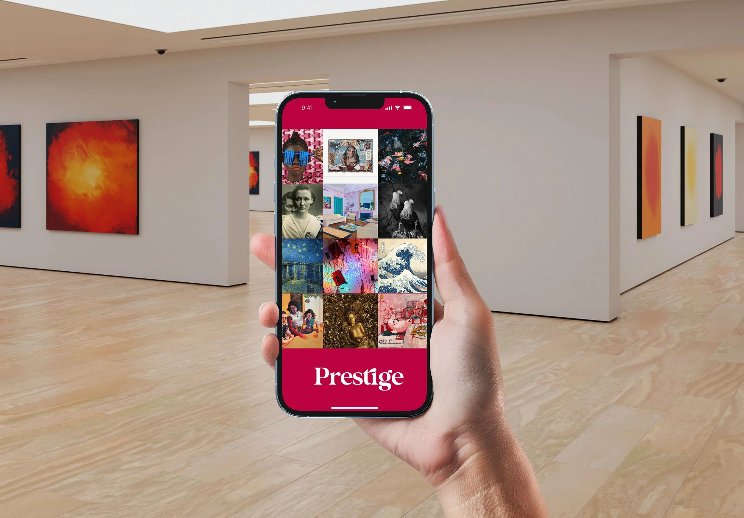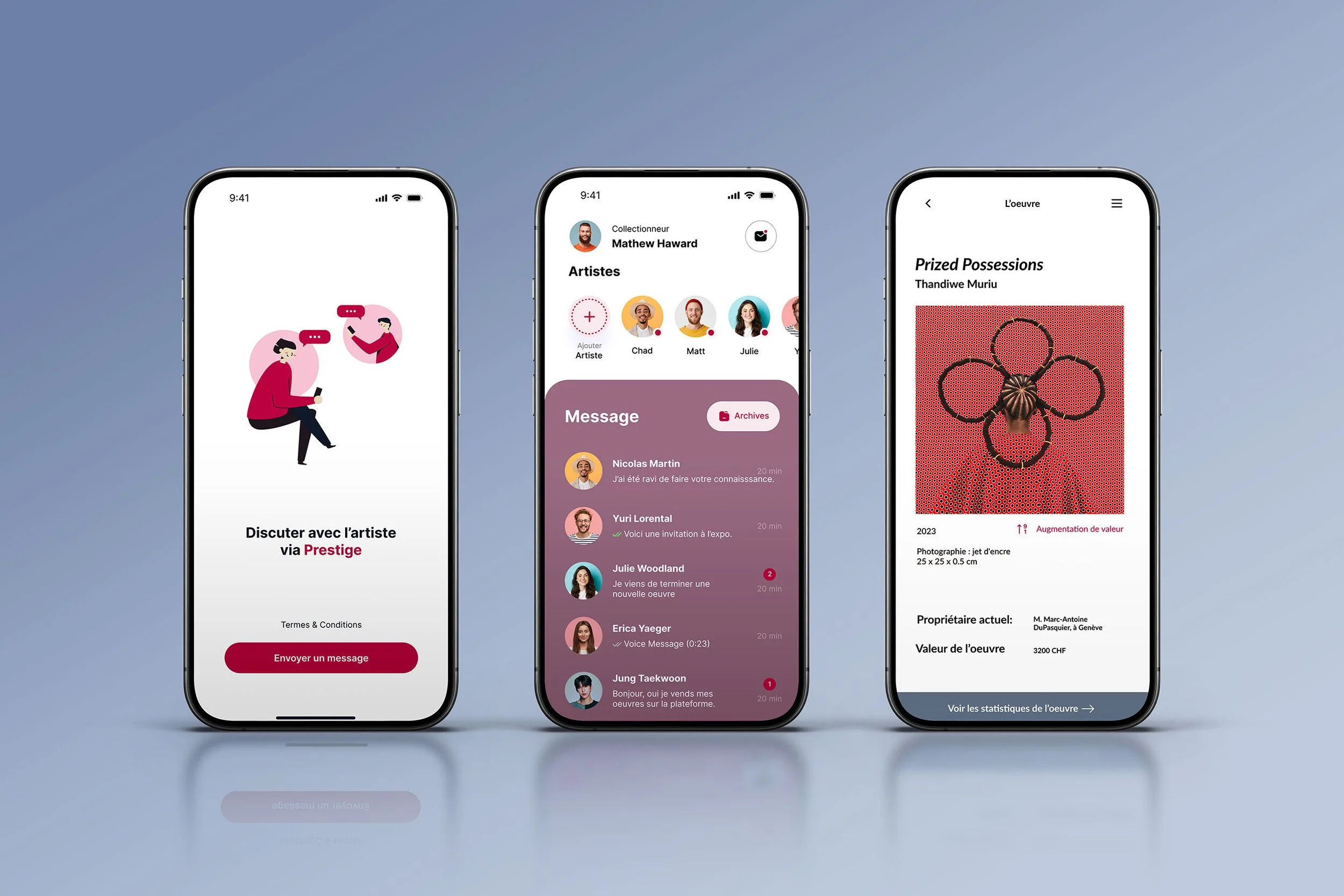• L’app Prestige pourrait faire découvrir des artistes émargeante, permettrait de discuter avec un artiste, réaliser des recherches à l’aide de divers mots-clés et filtres, voir le profil d’un artiste, ses oeuvres, ses prédictions et les statistiques (côte, historique, données PIB, présence en ligne, tendance mondiale, ventes, score sentimental, etc.)